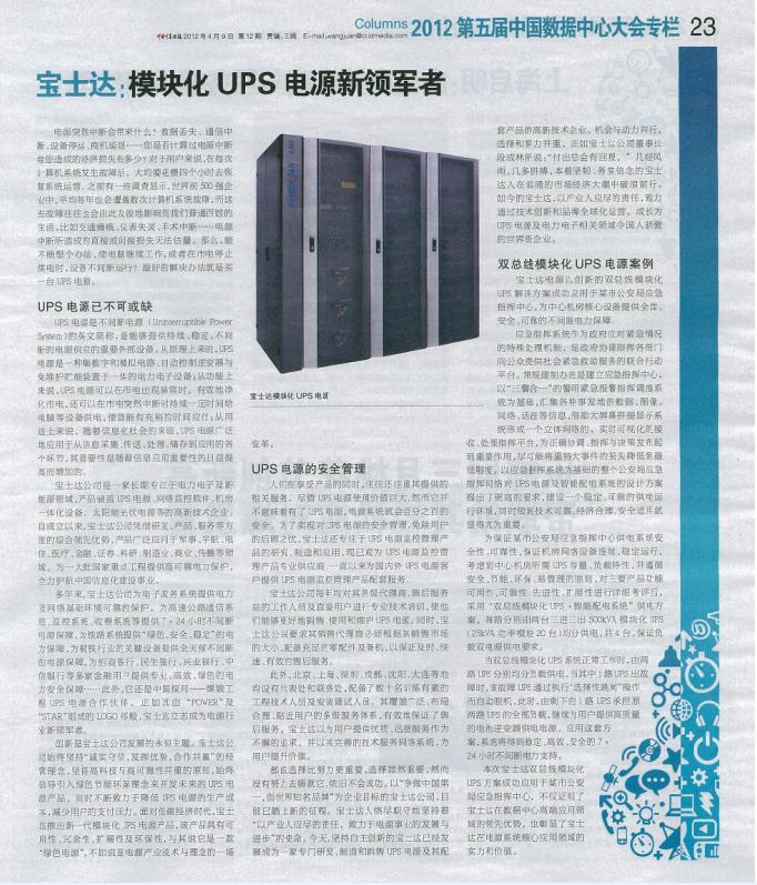2012年第12期《中國計算機報》對寶士達公司進行了題為《寶士達:模塊化UPS電源新領(lǐng)軍者》的大篇幅報道,報道內(nèi)容如下: