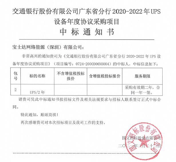 寶士達(dá)入圍交通銀行廣東省分行UPS集采項(xiàng)目