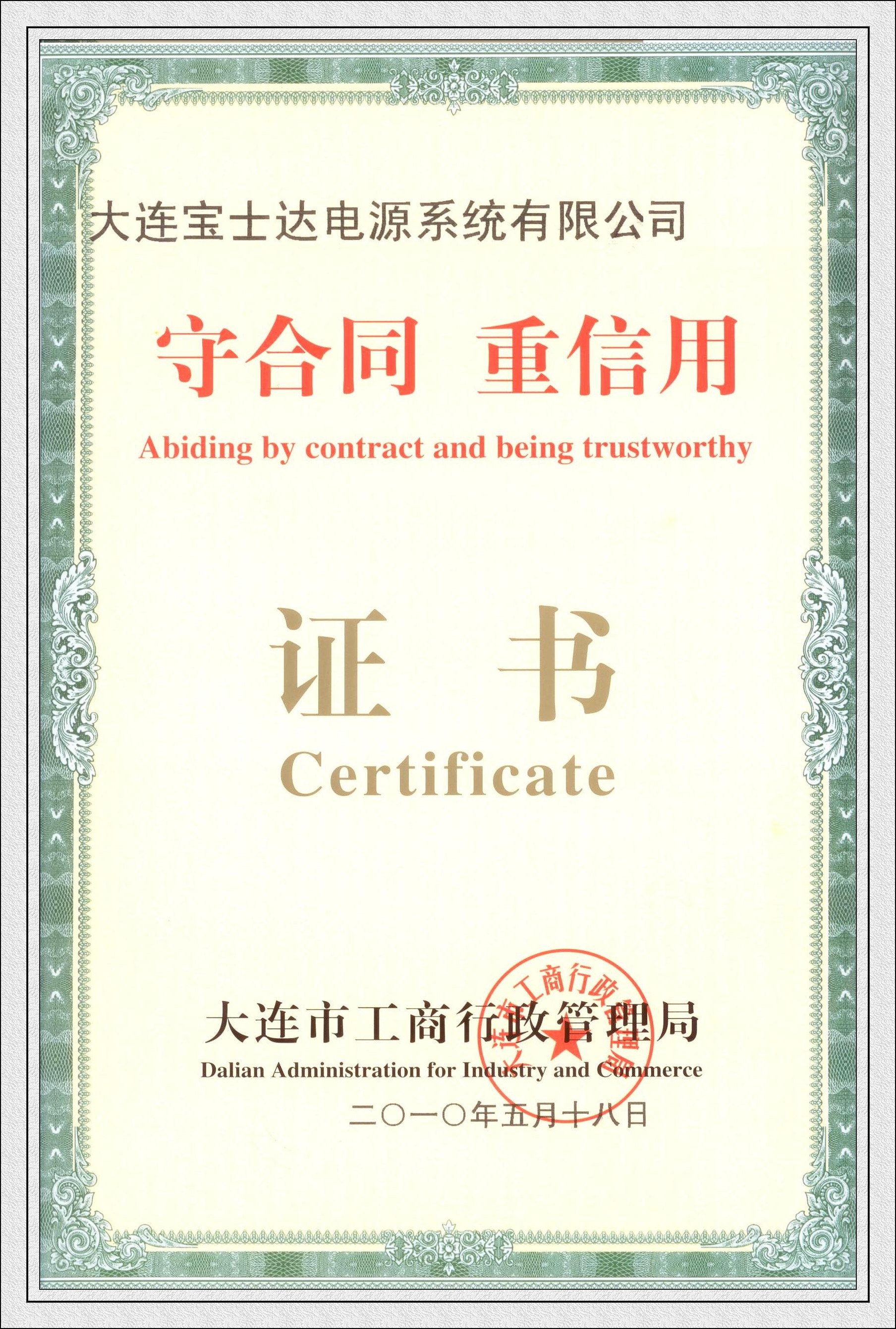 大連市工商行政管理局為表彰我公司的誠(chéng)信經(jīng)營(yíng),于2010年5月18日為我公司頒發(fā)“守合同重信用單位”牌匾和榮譽(yù)證書(shū)。