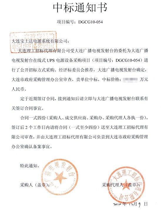 近日,大連廣播電視發(fā)射臺在線式UPS電源設備采購項目公開招標,此次招標,從產(chǎn)品的性能、供應商的綜合實力、售后服務能力、品牌影響力等方面對競標企業(yè)及產(chǎn)品進行了嚴格的篩選。寶士達憑借豐富的電源行業(yè)應用經(jīng)驗、專業(yè)的產(chǎn)品質量和優(yōu)質的服務保障,以絕對優(yōu)勢一舉中標。