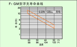 GM型充電電壓2.23-2.25V/單體,溫度在15-25℃時,壽命達15年見F7
