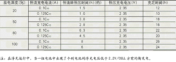 均衡充電采用先恒流,后按GM2.35V/單體恒壓充電,充電時間取決于放電深度。見下表: