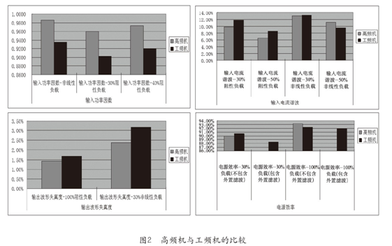 UPS的整流部分按照設(shè)計電路工作頻率的不同可分為高頻機和工頻機。高頻機采用較高工作頻率的PWM電路原理及微處理器控制技術(shù),工頻機采用傳統(tǒng)的模擬電路原理。兩者除了體積、重量的差異比較明顯外,在指標(biāo)參數(shù)方面也有所不同,圖2示出了兩者在輸入功率因數(shù)、輸入電流諧波成分、輸出波形失真度、電源效率等參數(shù)的統(tǒng)計數(shù)據(jù),工頻機的外置濾波器使效率下降1%左右。兩者的選擇要根據(jù)客戶的需求、安裝環(huán)境、負(fù)載情況等條件權(quán)衡考慮。