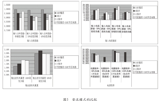 UPS整流器的工作原理可分為IGBT整流、6脈波模式為主、12脈波模式為主及可控整流+IGBT升壓電路,圖3中示出了各種整流模式的UPS在滿載、輕載、阻性負(fù)載、非線性負(fù)載條件下的四個參數(shù)的統(tǒng)計數(shù)據(jù),不同工作原理UPS的輸出參數(shù)差異較大。