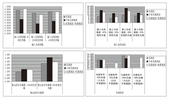 UPS的濾波方式對其技術(shù)指標(biāo)的影響也很大,圖4中示出了無濾波、只有無源濾波及無源濾波+有源濾波等三種模式的UPS在滿載、輕載、阻性負(fù)載、非線性負(fù)載條件下的四個參數(shù)的統(tǒng)計數(shù)據(jù)。
